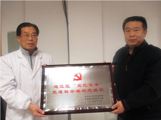 ▲图为党总支书记、副院长潮家宽接受“双比双争”奖牌