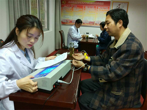 ▲耳鼻喉科鲁帆医生正在为居民检查耳道